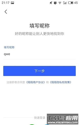 應(yīng)用后進(jìn)入注冊(cè)頁(yè)面,首先設(shè)置個(gè)人昵稱(chēng);