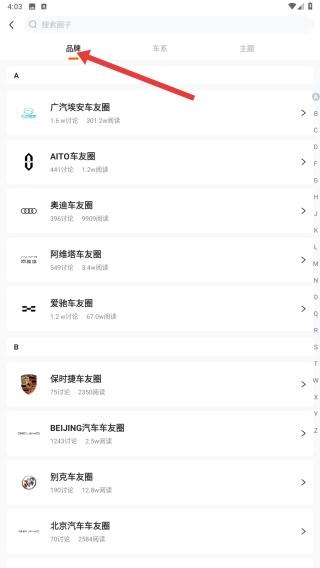 車圈頁面依據(jù)品牌進行分類排列,用戶能夠查看不同品牌社群的討論熱度以及具體內(nèi)容。