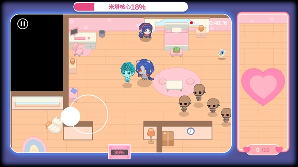這款游戲融合了老鷹抓小雞的經(jīng)典玩法與肉鴿元素,玩家需要在房間里持續(xù)跑動(dòng)以收集各類物品,過程中會(huì)隨機(jī)出現(xiàn)米塔角色,每個(gè)角色都帶有不同的加成效果。
