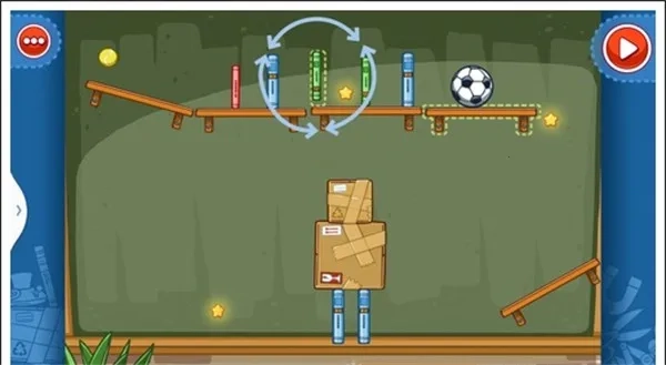 我們只需把兩個木箱疊放在中間的空白區(qū)域,就能讓球順利飛過,從而獲取星星。