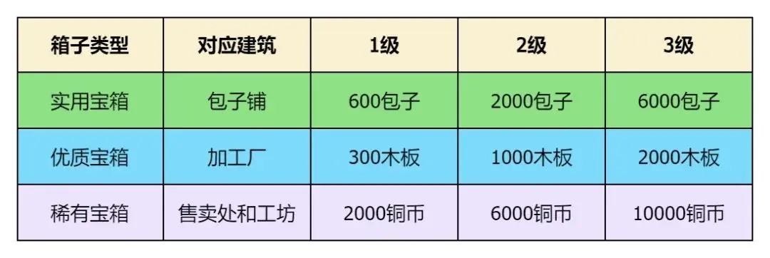 開(kāi)啟綠、藍(lán)、紫三種寶箱獲取的資源,和對(duì)應(yīng)的建筑存在關(guān)聯(lián)。所以在飛升進(jìn)入大世界后,應(yīng)當(dāng)優(yōu)先把系統(tǒng)等級(jí)提升到13級(jí),解鎖中級(jí)建造術(shù)。這樣一來(lái),就能將包子鋪、加工廠、售賣處以及工坊這些建筑的等級(jí)都升滿,從而讓開(kāi)啟寶箱得到的資源達(dá)到最大化。