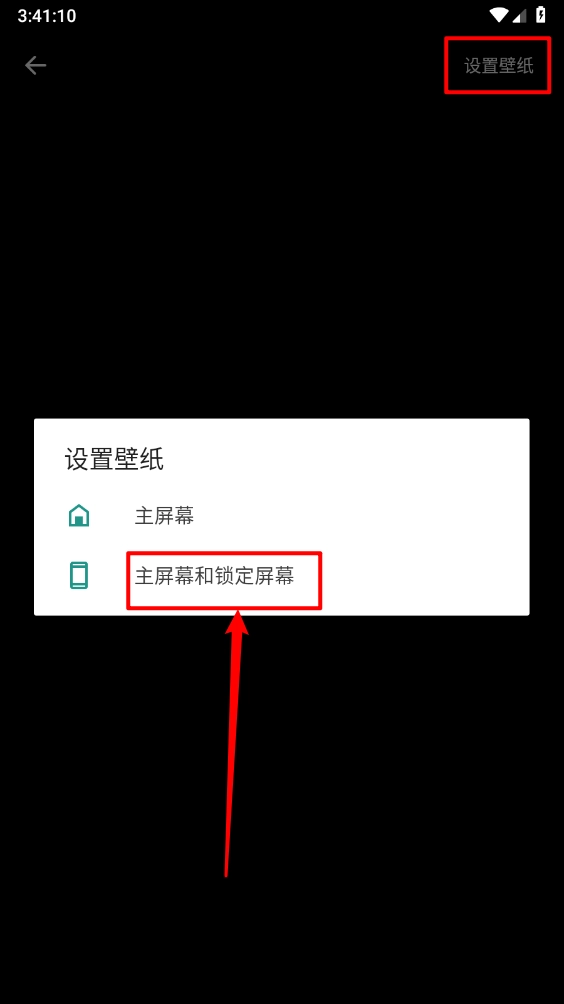 進入后點擊右上角的“設(shè)置壁紙”選項,此時會彈出一個選擇框,接著在框內(nèi)找到并選中“主屏幕和鎖定壁紙”這一選項就完成了。