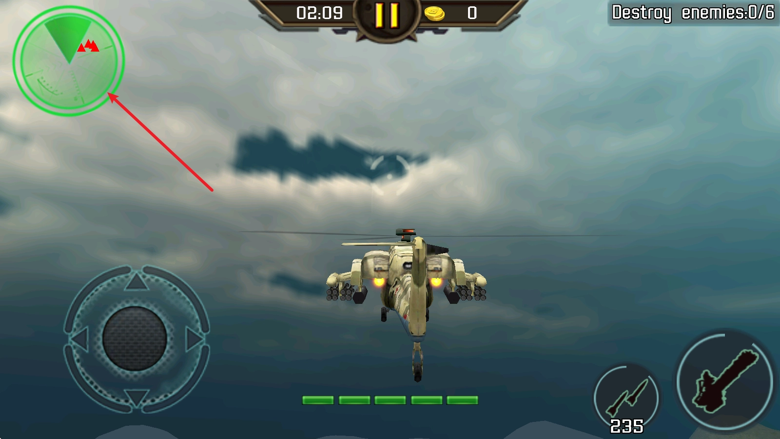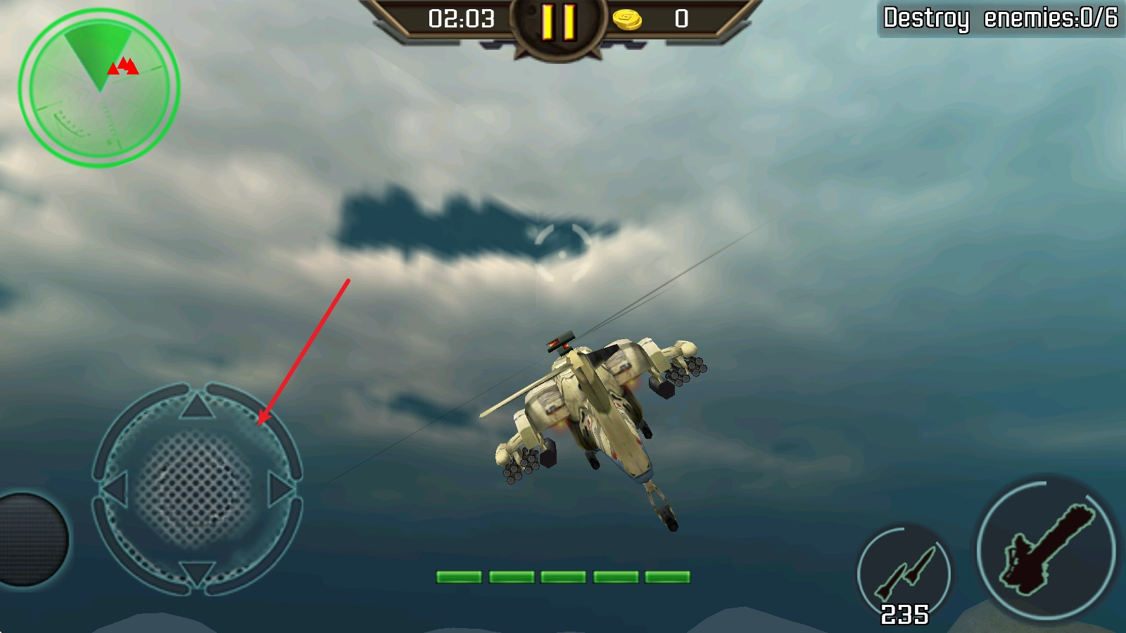 左側的虛擬搖桿控制直升機進行移動。