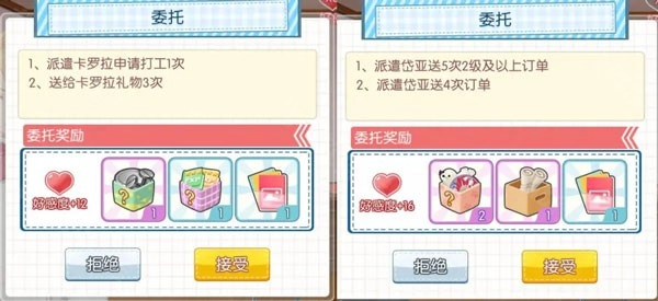游戲里每天都會刷新一批店員委托任務(wù),玩家每日最多能接5個。這些任務(wù)可以在店員房間的養(yǎng)成界面查看,也能在店內(nèi)點擊店員頭頂?shù)膰@號氣泡直接接取。不同任務(wù)對應(yīng)的好感度和獎勵各有差異,但每完成一個委托都能拿到一張約會指南。要留意的是,每個店員的體力上限是100點。要是店員體力不夠卻還在工作,說不定會消耗好感度。所以除了給店員喂美味的罐頭補充體力,讓他們適時去休息室歇一歇也很有必要。