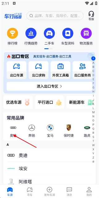 在車行168首頁(yè),點(diǎn)擊常用品牌里的奧迪選項(xiàng),即可進(jìn)入奧迪車型列表頁(yè)面。