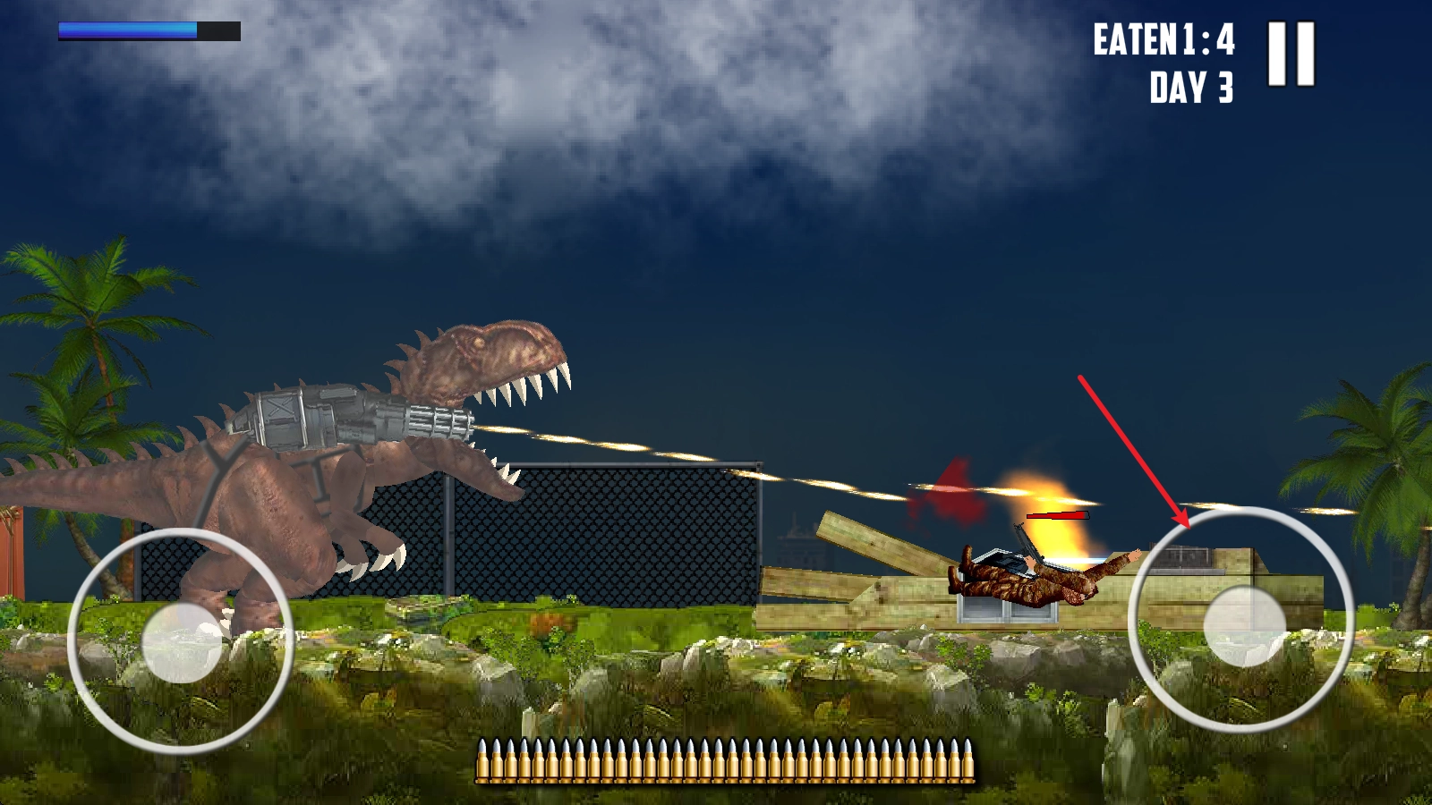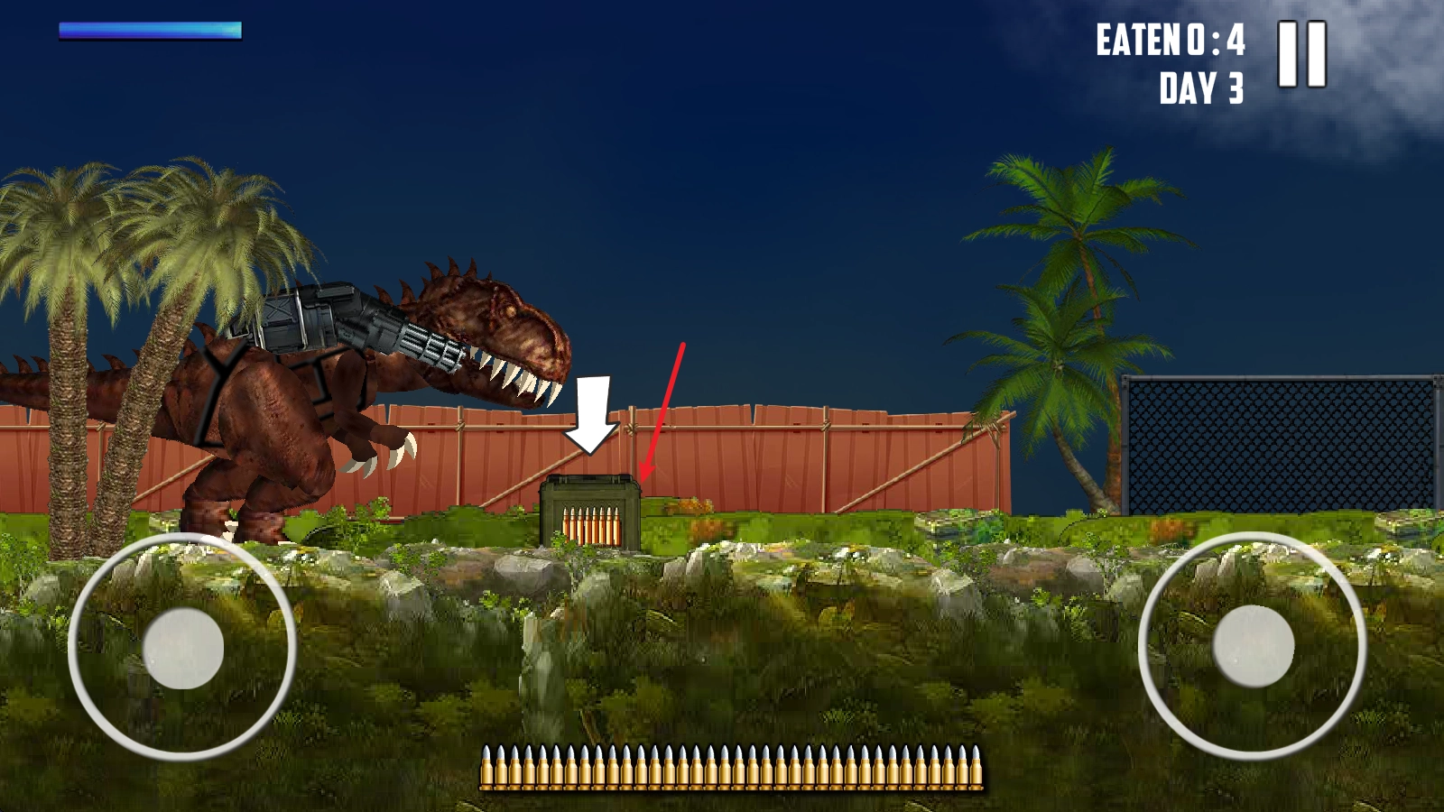 進(jìn)入游戲后,左邊的搖桿用來控制移動(dòng),右邊的搖桿則負(fù)責(zé)操控恐龍頭的方向。