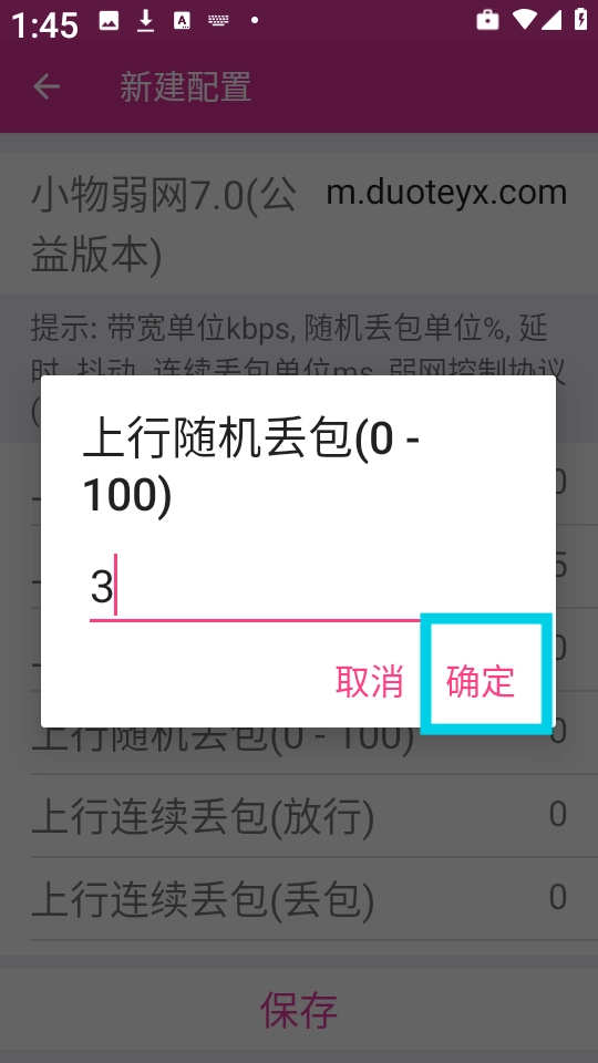 接著就能夠設(shè)置相關(guān)的弱網(wǎng)參數(shù)模板了,輸入完畢后,點(diǎn)擊“確定”按鈕進(jìn)行保存。