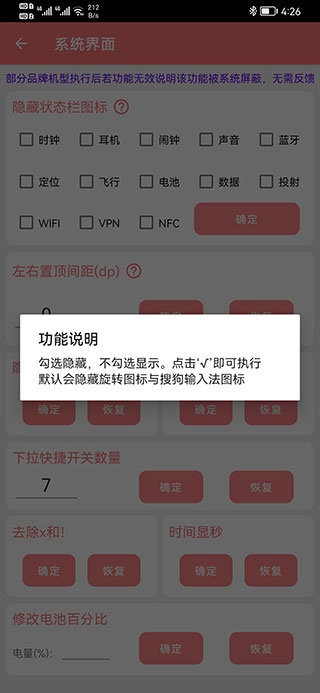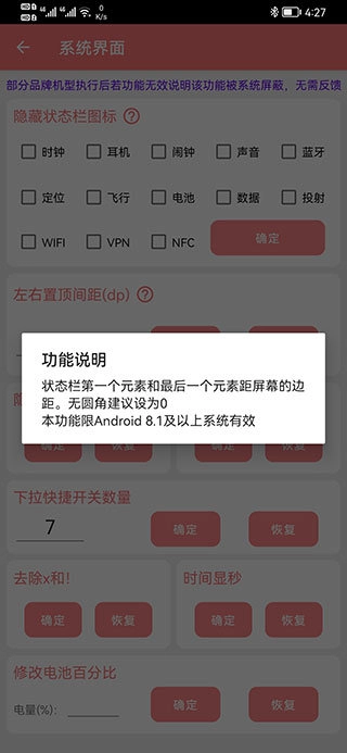 可以隱藏狀態(tài)欄圖標,調(diào)整左右置頂間距,隱藏導(dǎo)航欄與狀態(tài)欄,設(shè)置下拉快捷開關(guān)數(shù)量,去除x和!符號,讓時間顯示秒數(shù),以及修改電池百分比顯示方式。