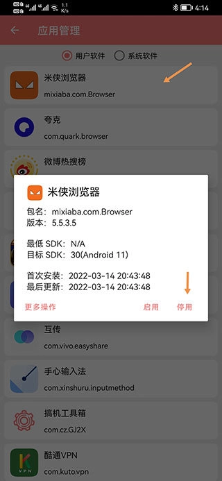 軟件列表分為用戶軟件與系統(tǒng)軟件兩類,點擊任意一款軟件會彈出其詳細信息,在彈窗右下角有“停用”按鈕,點擊即可停用該軟件。需要注意的是,此操作必須在設(shè)備已ROOT的前提下進行。若后續(xù)想要恢復(fù)軟件使用,只需以同樣的方式找到該軟件,點擊“啟用”按鈕即可。