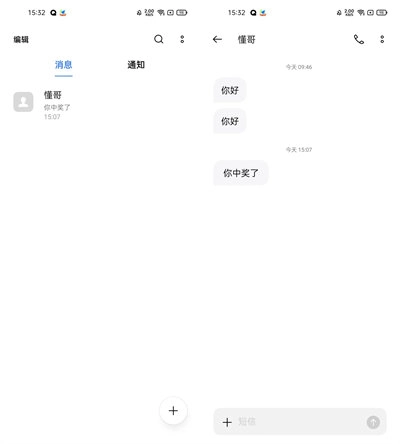 接下來,我們切換到手機(jī)自帶的短信界面,就能看到剛才設(shè)置的聯(lián)系人發(fā)送給你的消息了。