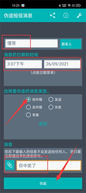 我們只需填寫好聯(lián)系人的姓名或電話、消息的日期與時間、偽造的消息類型以及短信內(nèi)容,隨后點擊底部的“偽造”按鈕就行。