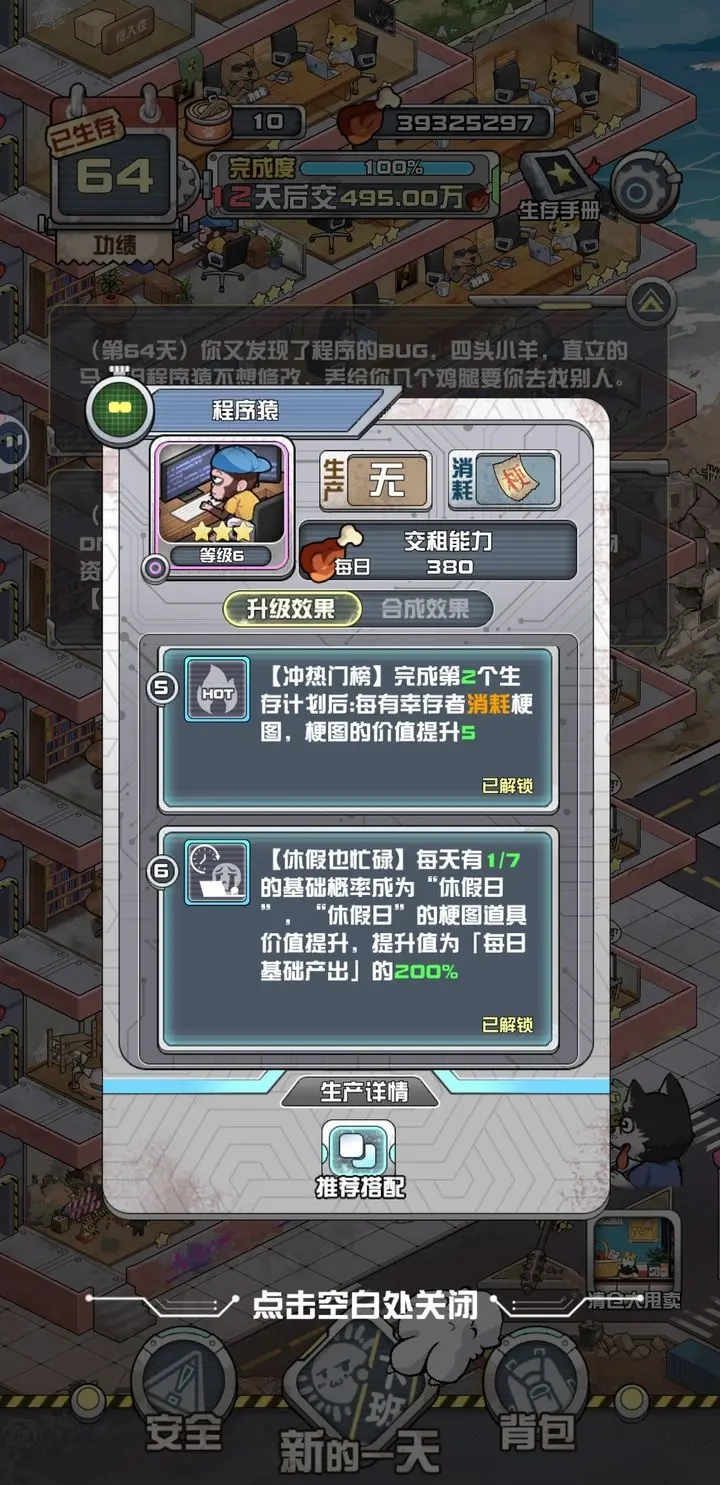 背包整理玩法、模擬經(jīng)營(yíng)與Roguelike的創(chuàng)新融合,以區(qū)別于初代的全新視角帶來別樣體驗(yàn),保留簡(jiǎn)單爽快的核心玩法,延續(xù)“梗中嵌游戲”的制作理念,讓你在末日世界也能輕松躺平賺雞腿!
