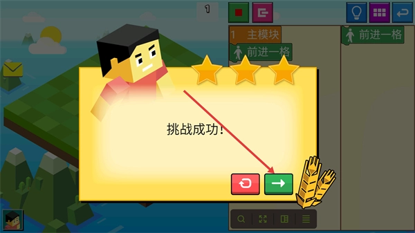 挑戰(zhàn)完成后,點(diǎn)擊綠色箭頭按鈕,就能繼續(xù)體驗(yàn)后面的游戲內(nèi)容了。