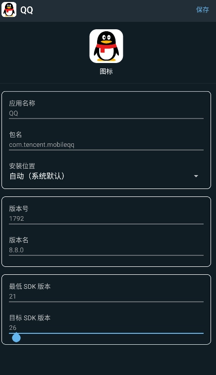 3、你可以修改APK的圖標(biāo)、應(yīng)用名稱、包名等信息,修改完后點(diǎn)擊保存即可。