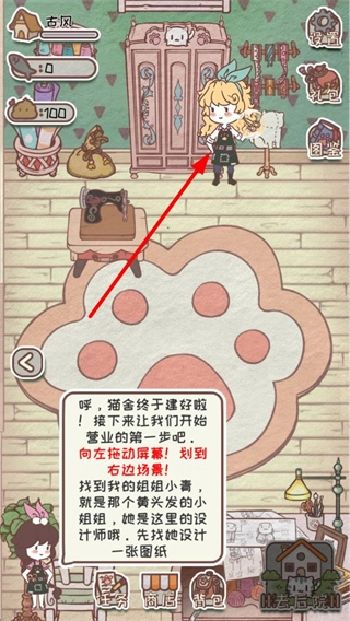 向左滑動(dòng)屏幕切換場景,找到黃發(fā)設(shè)計(jì)師小青,點(diǎn)擊她后選擇敷衍設(shè)計(jì)選項(xiàng),就能免費(fèi)得到普通設(shè)計(jì)圖紙。