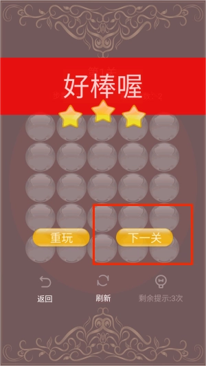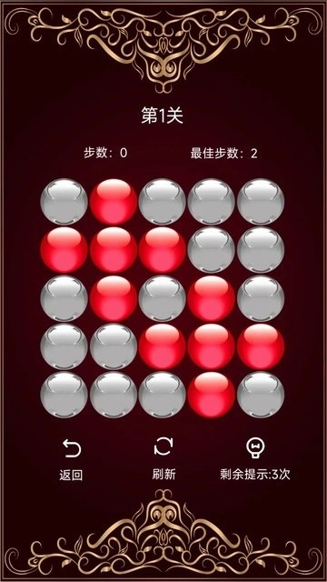 當(dāng)所有球體變?yōu)榘瞪珪r(shí)即表示通關(guān)成功,系統(tǒng)會(huì)展示所用步數(shù)并給出對應(yīng)的星級(jí)評定。