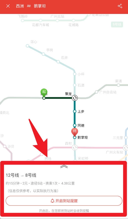 生成出行方案后,系統(tǒng)會(huì)呈現(xiàn)換乘路線、途經(jīng)站點(diǎn)數(shù)量以及預(yù)計(jì)耗時(shí),同時(shí)還提供到站提醒功能的開(kāi)啟選項(xiàng)。