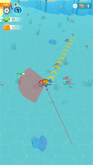 控制角色在水下區(qū)域移動,順著黃色箭頭指示的路線,收集魚類與各類資源。
