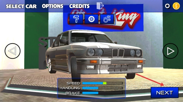 選擇銀色轎車時(shí)需查看Speed/Handling/Brake屬性,之后點(diǎn)擊【NEXT】,即可進(jìn)入場(chǎng)景選擇環(huán)節(jié)。