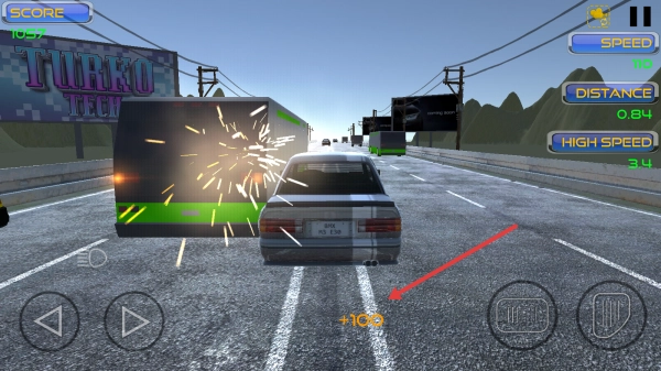 駕駛過(guò)程中要避開貨車,發(fā)生撞車會(huì)被扣分,吃到“+100”道具能增加分?jǐn)?shù),同時(shí)留意右側(cè)的Speed/Distance等數(shù)據(jù),保持高速狀態(tài)沖過(guò)終點(diǎn)線。