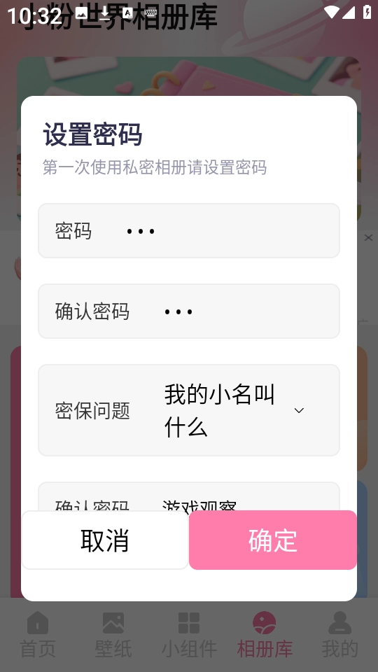 進入“相冊庫”后,自行設置密碼與密保問題,點擊確定按鈕就能創(chuàng)建私密相冊。