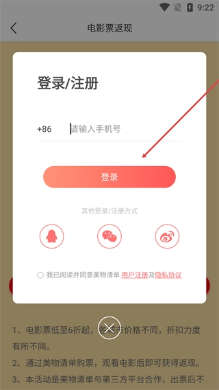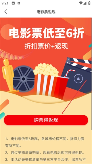 進(jìn)入【電影票返現(xiàn)】頁面后,點(diǎn)擊頁面上的【購票得返現(xiàn)】按鈕。