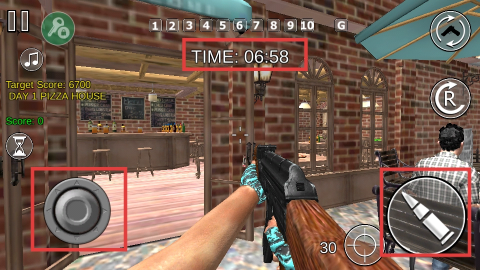 通過左側(cè)的虛擬搖桿來操控移動(dòng)方向,右側(cè)的射擊按鈕用于發(fā)起攻擊;在游戲場景里破壞各類物品,同時(shí)要留意時(shí)間限制【TIME:06:58】。