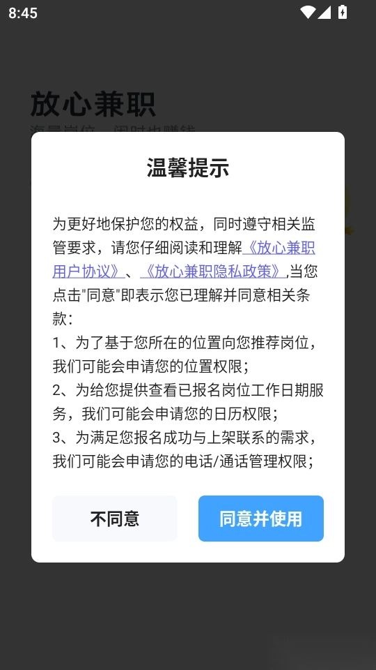 首先打開軟件,閱讀“溫馨提示”內(nèi)容后,點(diǎn)擊“同意并使用”按鈕即可進(jìn)入。