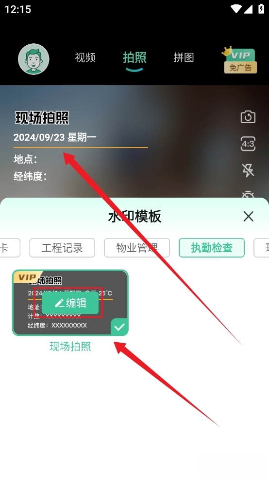 點(diǎn)擊【水印模板】即可進(jìn)入模板選擇界面,這里提供考勤打卡、工程記錄、物業(yè)管理、執(zhí)勤檢查等不同場(chǎng)景的水印模板資源。