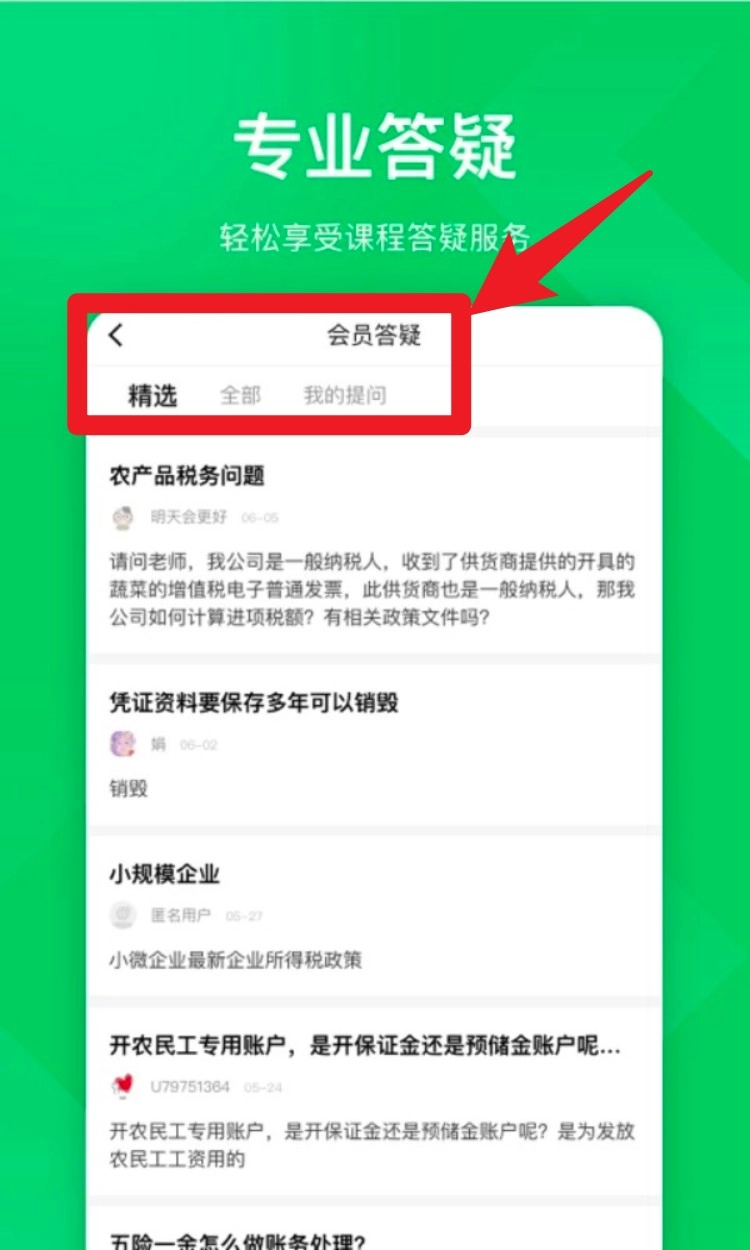 進(jìn)入會(huì)員答疑頁面后,既能瀏覽精選提問,也可切換至“我的提問”查看個(gè)人提問記錄。