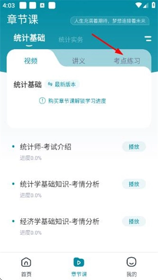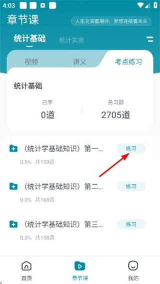 在統(tǒng)計師優(yōu)題首頁,點擊底部的章節(jié)課選項,即可進入章節(jié)課頁面。