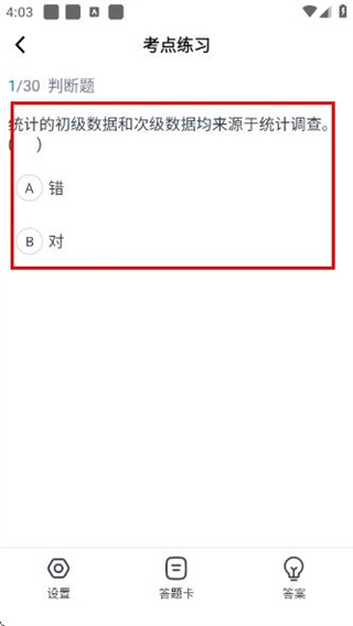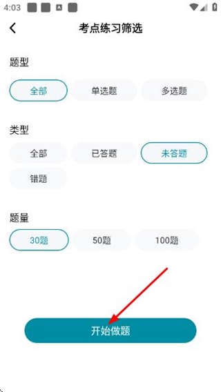 在考點練習(xí)的篩選頁面設(shè)置好條件后,點擊“開始做題”按鈕,即可進入考點練習(xí)的做題頁面。