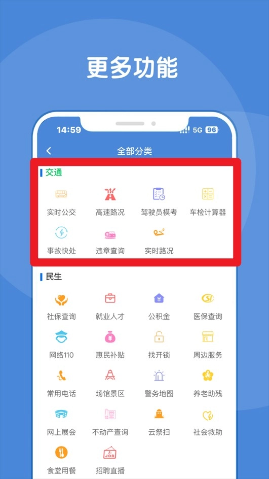 進入全部分類頁面后,能看到交通、民生等各類功能,還可以進行公交、違章、不動產(chǎn)等信息的查詢。