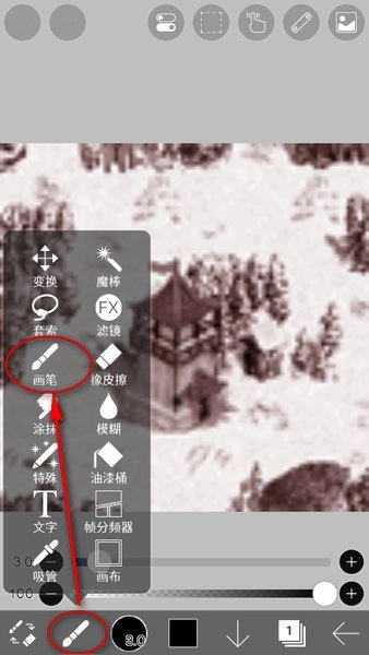 打開愛筆思畫x,隨意創(chuàng)建一個新畫布,導入圖片開展編輯工作,點擊底部第二個“筆刷”圖標,然后選擇“畫筆”選項。