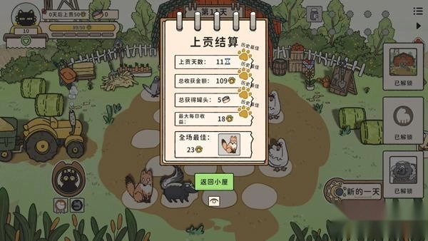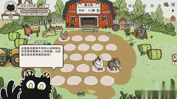 進(jìn)入游戲后的界面如圖所示,玩家需要按照引導(dǎo)進(jìn)行操作:每天點(diǎn)擊養(yǎng)殖的動(dòng)物來(lái)獲取金幣,等到規(guī)定的天數(shù)結(jié)束后,再向貓神供奉祭品。