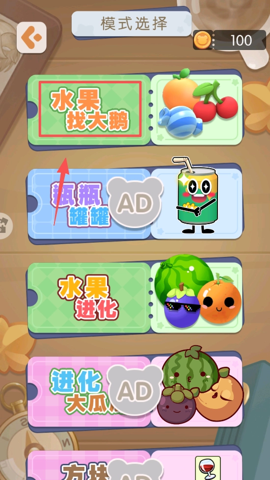 在“模式選擇”界面,你可以點(diǎn)擊“水果找大鵝”這類模式,挑選出自己喜歡的游戲模式。