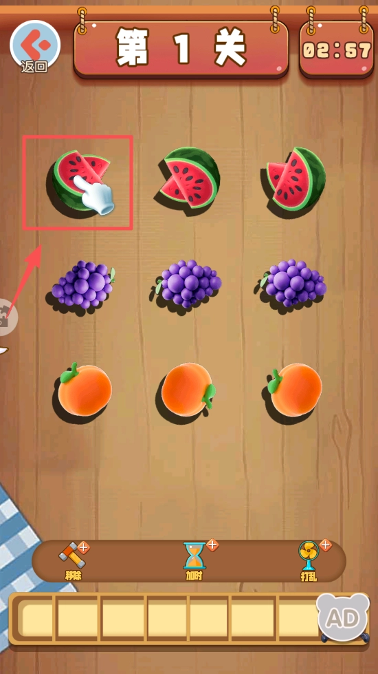 在游戲關(guān)卡里,點(diǎn)擊水果來完成匹配,達(dá)成關(guān)卡設(shè)定的目標(biāo),以此來考驗(yàn)?zāi)愕姆磻?yīng)能力。