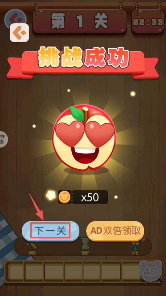 當(dāng)挑戰(zhàn)成功后,點(diǎn)擊“下一關(guān)”按鈕,繼續(xù)游戲,獲取更多樂趣和獎勵。