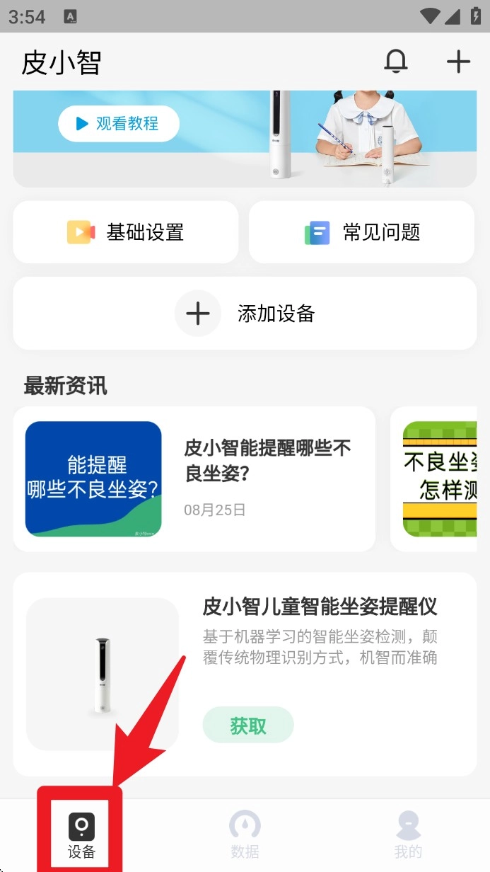 在首頁點(diǎn)擊下方的設(shè)備圖標(biāo),進(jìn)入頁面后點(diǎn)擊添加設(shè)備,按照提示完成首次連接的設(shè)置。