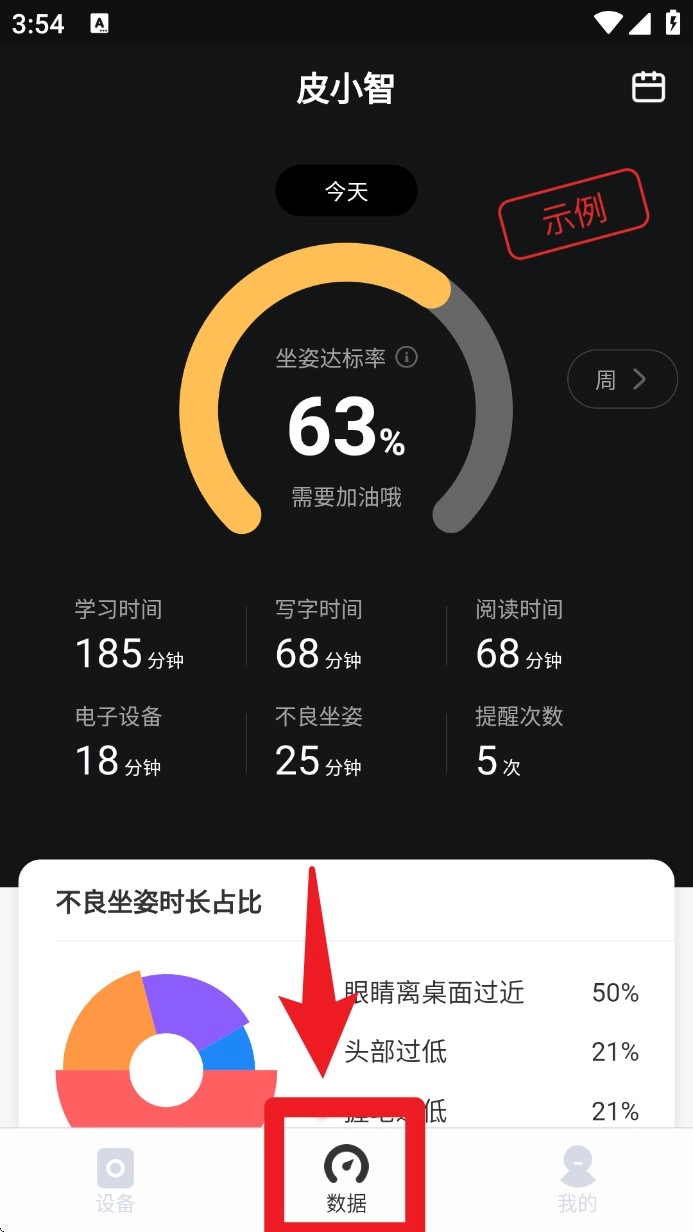 進(jìn)入底部導(dǎo)航欄的數(shù)據(jù)頁面,就能查看坐姿達(dá)標(biāo)率、不良姿勢統(tǒng)計(jì)、提醒次數(shù)等各類詳細(xì)數(shù)據(jù)。