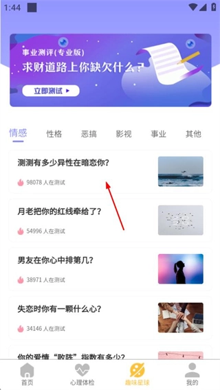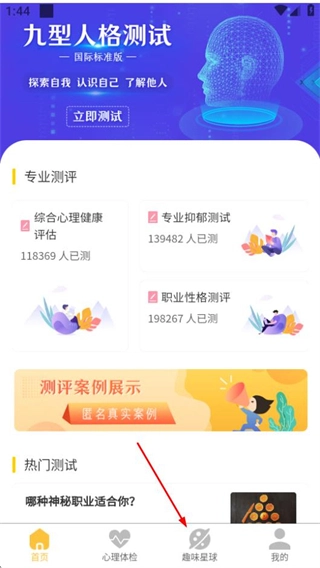 在抑郁癥焦慮癥測試的首頁,點擊底部的趣味星球選項,就能進入趣味測試的分類頁面。