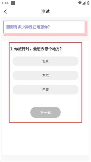 在趣味測試分類頁面,點擊“測測有多少異性在暗戀你”這個測試,就能進入到該測試的題目頁面。
