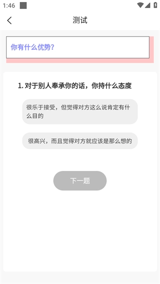 在測試題目頁面,選定相應選項后點擊下一題按鈕,以推進測試流程。