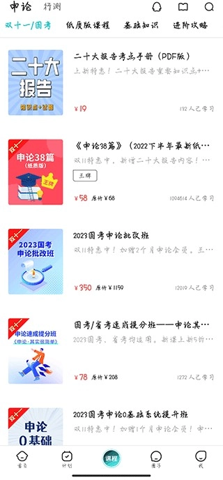 課程界面包含申論與行測(cè)的各類學(xué)習(xí)課程,像紙質(zhì)版教程、基礎(chǔ)知識(shí)、進(jìn)階攻略等都在其中。