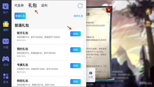 在進入的界面選擇禮包,然后選擇下方的領取。