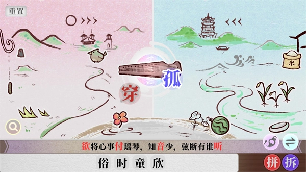 點擊拆分出來的漢字,再將它們兩兩拼接,組合成詩詞里需要的、標紅的漢字。等詩詞中的所有漢字都拼好,就能通關(guān)了。