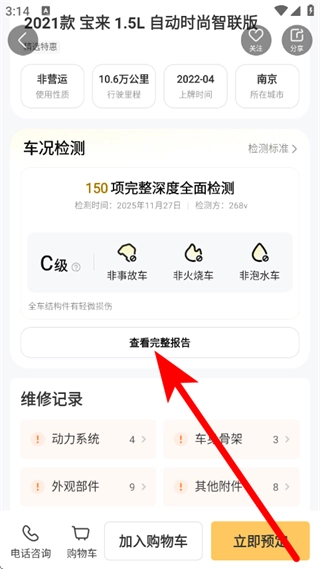 在車輛詳情頁,點擊“查看完整報告”,即可進入驗車報告頁面。