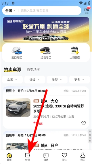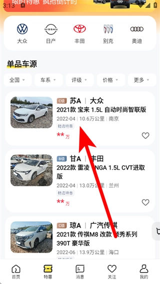在神州二手車的首頁,點擊底部的“特惠”選項,即可進入單品車源頁面。