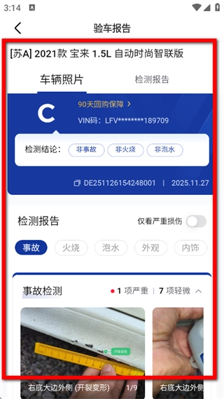 在驗車報告頁面,可查看車輛的檢測結(jié)論、事故檢測等詳細車況信息。