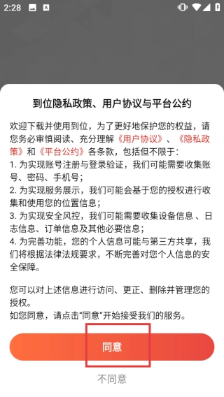 打開“到位”應(yīng)用后,會彈出【到位隱私政策、用戶協(xié)議與平臺公約】的窗口,此時點(diǎn)擊【同意】按鈕,即可接受相關(guān)條款并繼續(xù)使用該應(yīng)用。